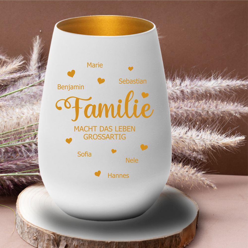 Das Windlicht ist hier mit dem Text FAMILIE- MACHT DAS LEBEN GROSSARTIG versehen. Das besondere ist hierbei die wahllose Anordnung der Namen, die auf dem Windlicht verteilt werden. Verziert ist dieses schöne Windlicht mit mehreren verspielten Herzen. Diese peppen das Design auf.