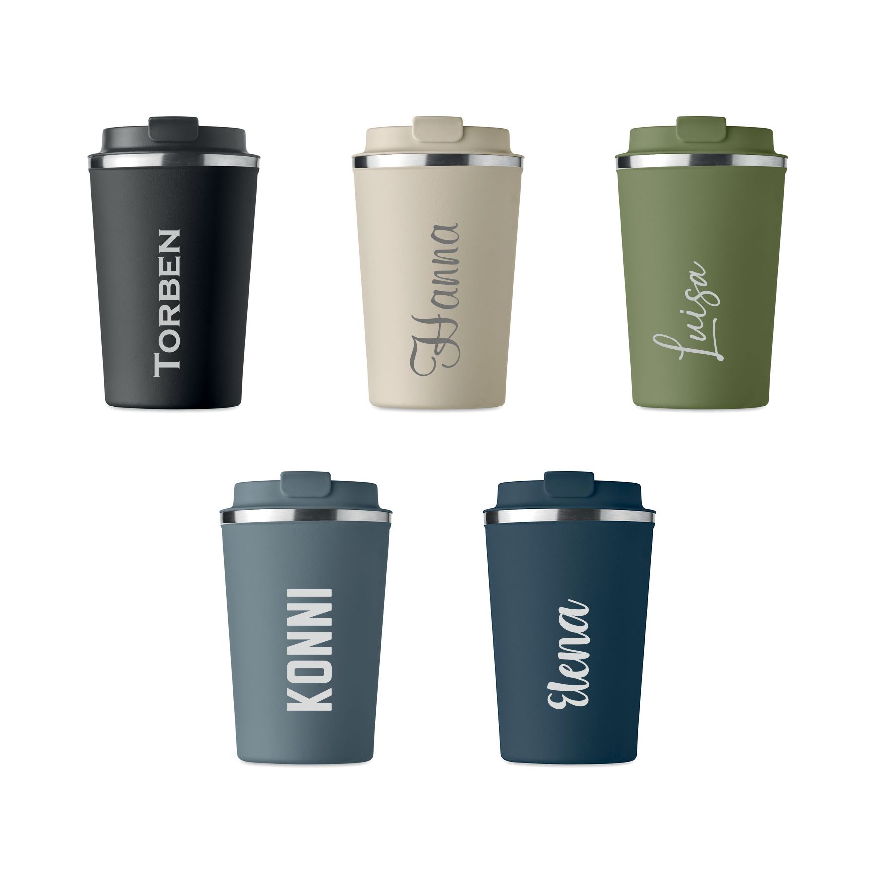 Hol auch Du dir den schönen Becher. Bei der Gravur wird die obere Beschichtung abgetragen und die Edelstahlbeschichtung kommt zum Vorschein. Daher wird die Lasergravur auch silbern-grau.